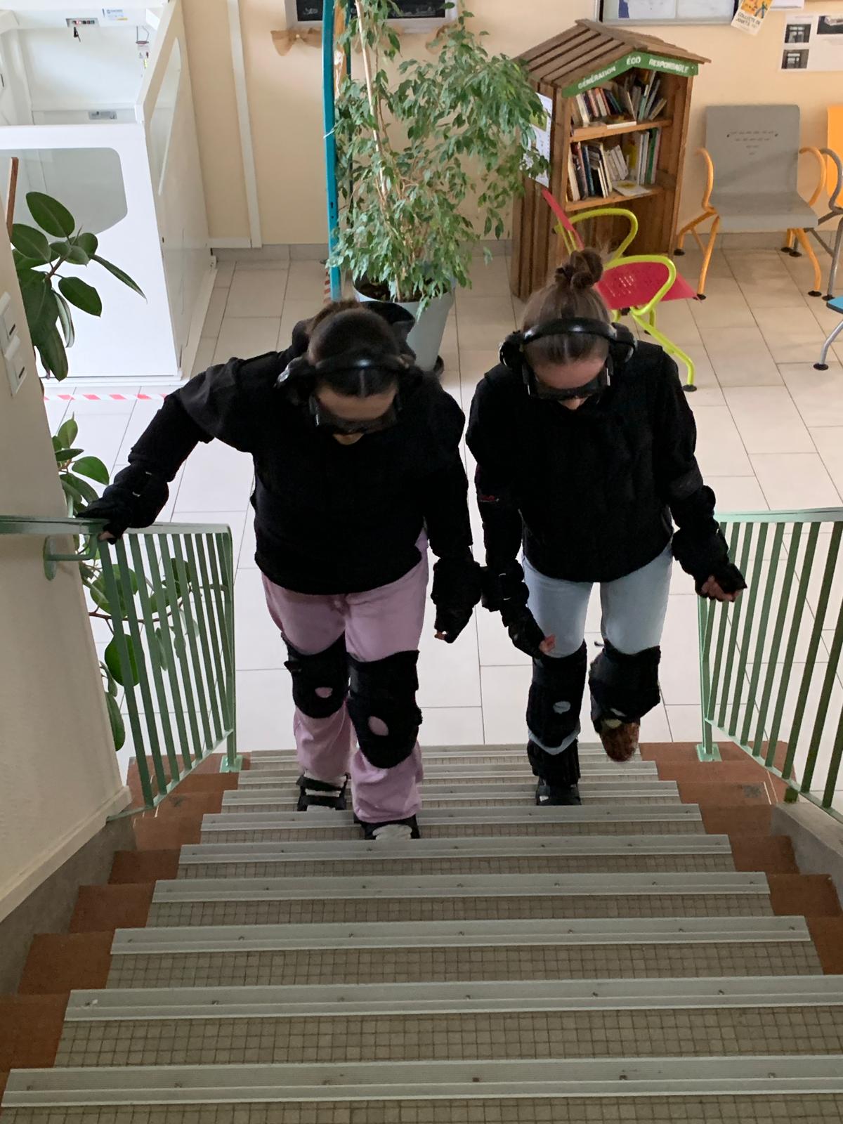 Afin de ressentir ces contraintes en mouvement, nous avons fait le tour de la MFR en montant et descendant les escaliers .