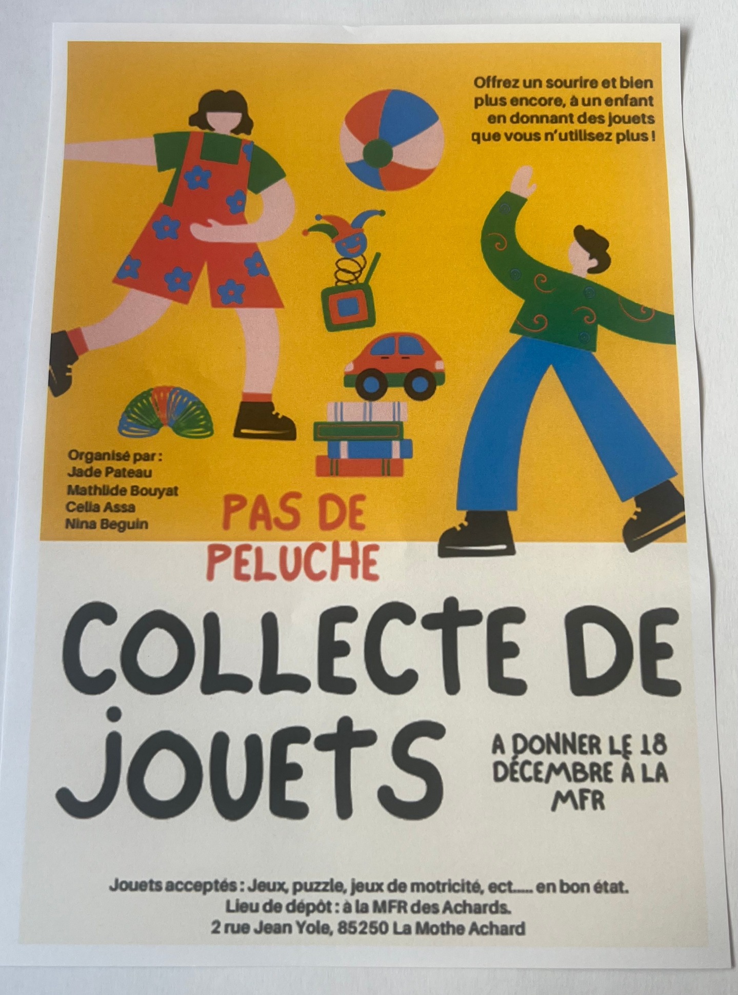 Un groupe d’élèves de terminale s’est associé avec l’association des Restos du Cœur de La Roche-sur-Yon dans le cadre de leur projet professionnel, qui sera évalué lors d’un CCF. Pour cela, elles ont décidé d’organiser une collecte de jouets afin d’apporter du bonheur aux enfants qui en ont besoin. Nous comptons sur vous pour venir les bras chargés de générosité jusqu’au 18 décembre 2025 à la MFR !